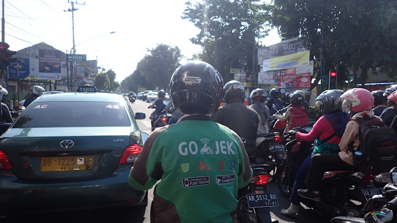 Както винаги, най-интересно на мен ми беше да хвана мотор и да обиколя. И наистина, самият град не ме впечатли толкова колкото местата извън него. А отправната точка бе най-големият будистки храм в света - Борободур. Храмът е извън града и съответно потеглих предишния ден с идеята да пренощувам в хостел близо до него, а на следващия да го посетя по изгрев. До сега бях карал мотор в Азия само на малки райски острови, а сега излизах в час пик да прекося град с население няколко милиона. Усещах напрежение първите минути, но после се слях с местните мотористи и усетих как кефът взима връх над притеснението. В Индонезия хората се предвижват главно с мотори и само малка част с коли, така че движението е организирано в полза на мотористите.
