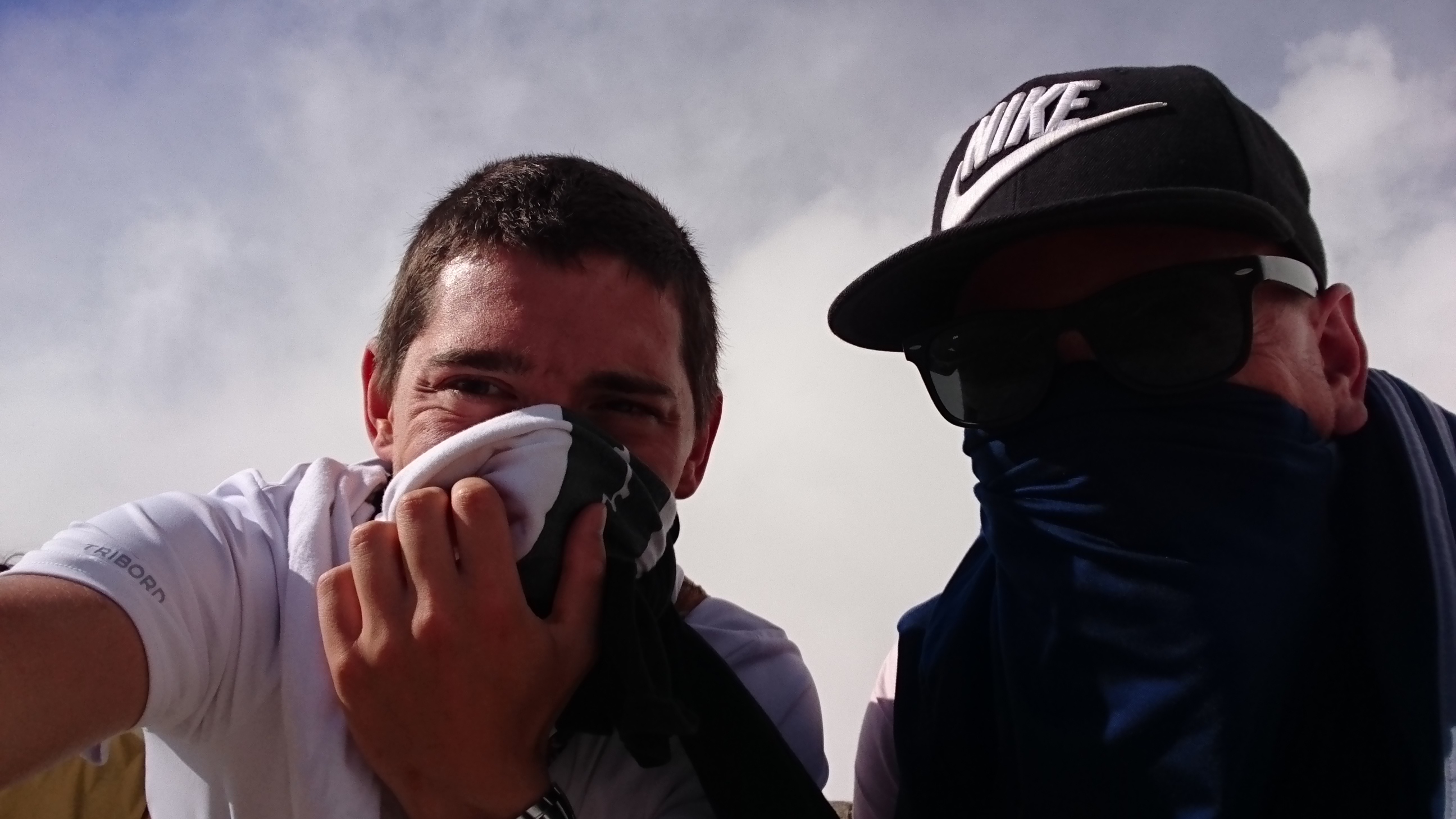 Определено е величествено място да се види на живо - както от далеч (като на горната снимка), така и от близо (като на долната). Доста от хората се бяха снабдили предварително с противогази, но ние не бяхме сред тях и използвахме подръчни средства, за да се предпазим от сярата. Буквално направихме една снимка на върха и тръгнахме надолу, тъй като положението си беше сериозно.